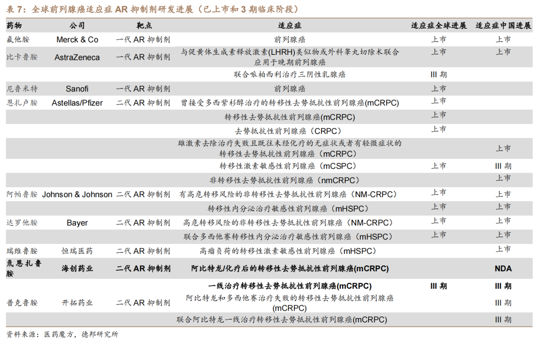 目前中国共有6款AR抑制剂获批上市,包括默沙东原研的氟他胺、阿斯利康的比卡鲁胺、安斯泰来的恩扎卢胺、西安杨森的阿帕鲁胺、拜耳的达罗他胺和恒瑞医药的瑞维鲁胺。第一代AR抑制剂包括氟他胺、尼鲁米特、比卡鲁胺,第二代AR抑制剂包括恩扎卢胺、阿帕鲁胺、达罗他胺和瑞维鲁胺等。