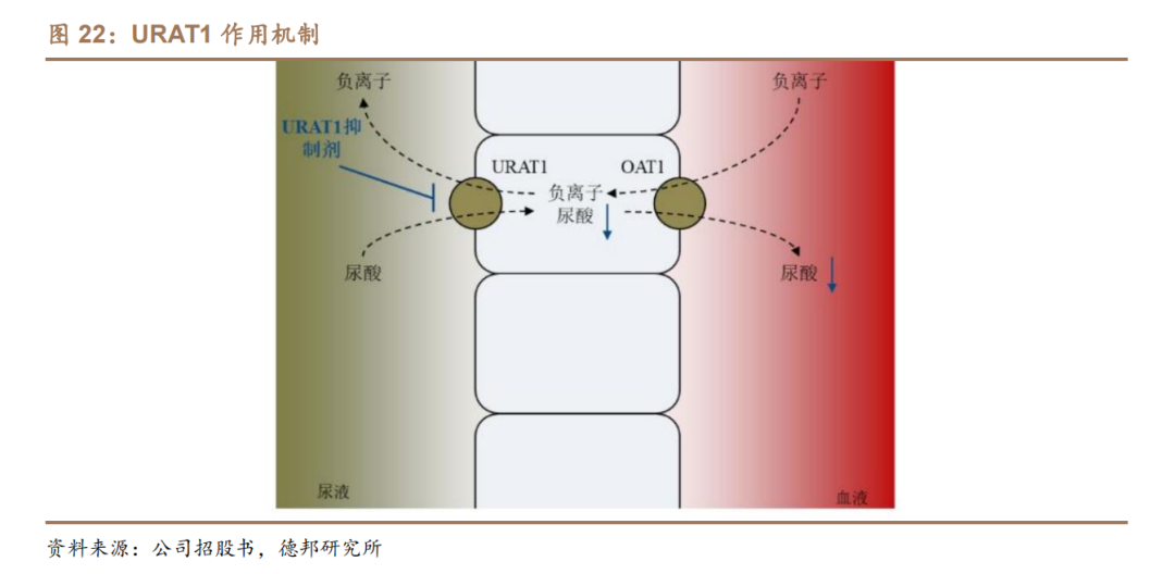 URAT1抑制剂作用机制:URAT1是位于肾小管上皮细胞刷状缘膜上的尿酸转运蛋白,理论上抑制它就能增加尿酸的排出量,从而降低血尿酸、减少痛风的患病及发病概率。URAT1被认为是治疗高尿酸血症/痛风的一个重要靶点,现有URAT1抑制剂如苯溴马隆有发生爆发性肝炎的风险以及雷西纳德具有升高血肌酐、损伤肾功能等副作用,因此,URAT1抑制剂的开发重点在于降低毒副作用,提高安全性。