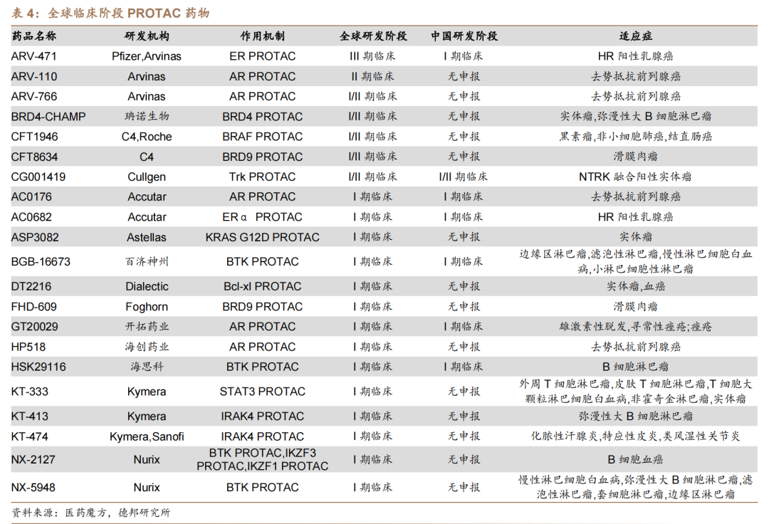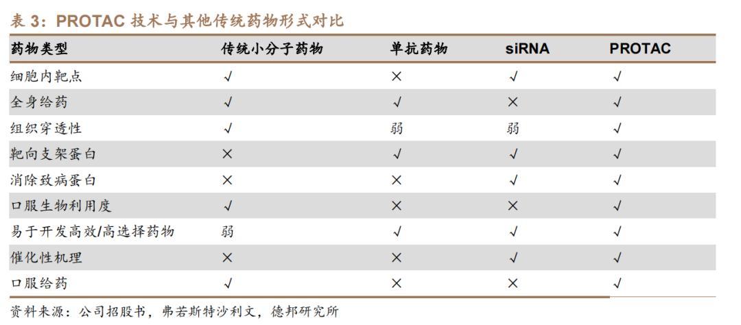 PROTAC技术可靶向不可成药靶点及解决药物耐药性问题。利用双功能小分子靶向降解目标蛋白,被认为是生物医药领域的革命性技术。PROTAC药物具有高活性,高选择性,解决耐药性的潜力及靶向传统的不可成药性靶点等特点,在新药研发方面有广阔的前景和潜力。