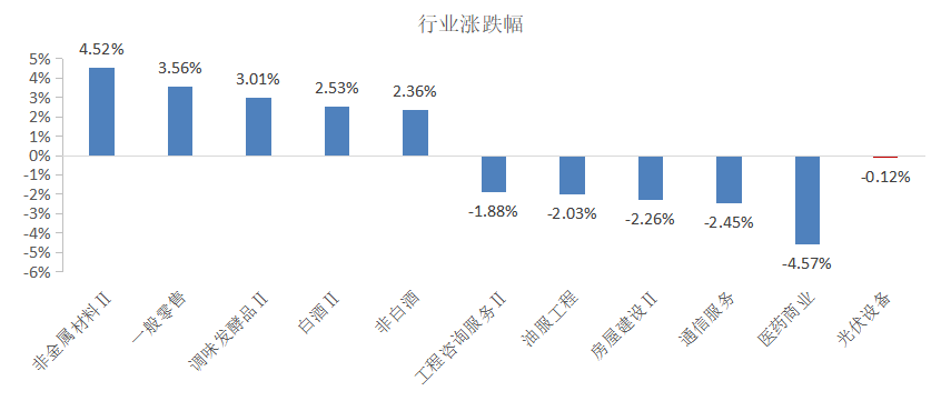 12月6日,光伏设备行业下跌0.12%,沪深300上涨0.54%,光伏设备行业跑输大盘0.66pct。从全行业看,涨幅前五行业分别是非金属材料Ⅱ(4.52%)、一般零售(3.56%)、调味发酵品Ⅱ(3.01%)、白酒Ⅱ(2.53%)和非白酒(2.36%)。