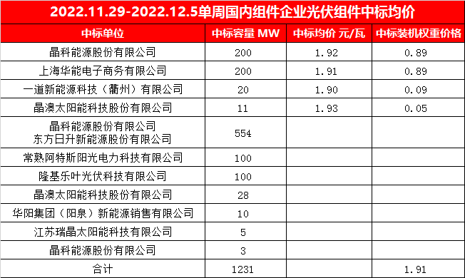 11月29日至12月5日当周SMM统计国内包括晶科、东方日升等多家企业中标光伏组件项目,中标价格分布区间集中1.90-1.93元/瓦,单周加权均价为1.91元/瓦,相比上周均价小幅回升0.02元/瓦,终结了延续五周的下跌趋势;单周中标装机容量为1.23GW,位于年内正常水平。(上海有色网)