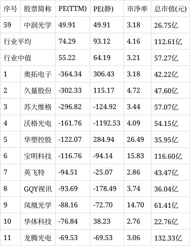 从行业市盈率排名来看,公司所处的光学光电子行业市盈率平均74.29倍,行业中值55.22倍,中润光学排名第59位。