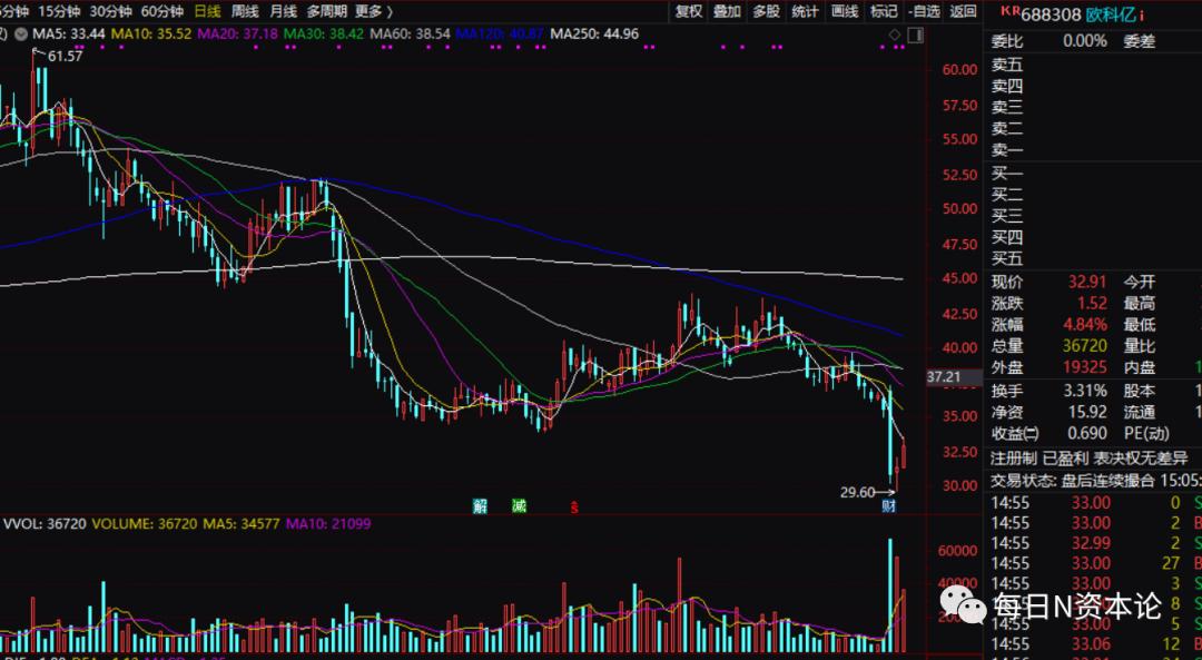 请注意,欧科亿股价在今年2月13日摸高86.9元(不复权)之后,股价便调头向下,半年时间跌幅超过了65%。尤其是今天最低价已经达到了29.6元,与其历史最低点23.13元十分接近。