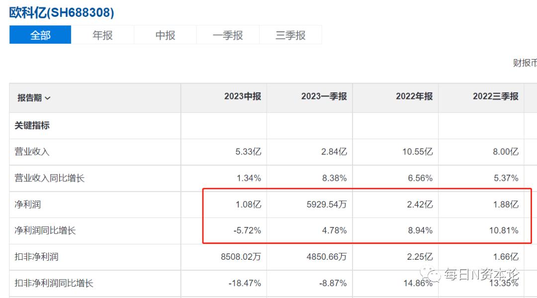 欧科亿的财报显示,2020年上市后,其净利润增长率的变化呈现一个抛物线的走势。2020年其净利润为1.07亿元,同比增长21.5%;2021年净利润为2.22亿元,同比大增106.82%;2022年净利润为2.42亿元,同比增长开始明显放缓。2023中报,净利润同比为负值。