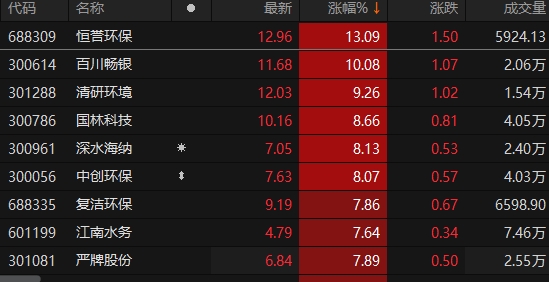 2月19日早盘,申万一级行业板块中,环保板块震荡上行。截至10时00分,恒誉环保涨超13%,百川畅银涨逾10%,清研环境涨超9%,国林科技、深水海纳、中创环保等跟涨。