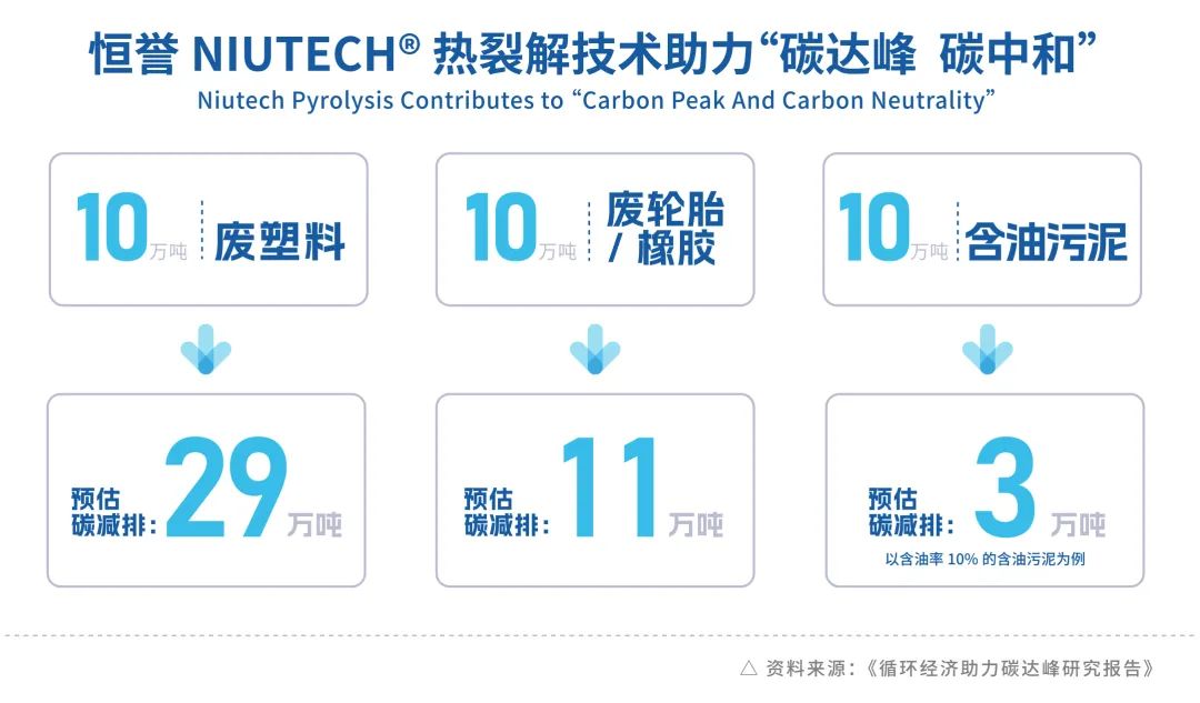 今年1月,全国温室气体自愿减排交易(CCER)正式重启;今年5月,《碳排放权交易管理暂行条例》正式施行……这是“双碳”目标带来的新机遇、新增长点。根据中国循环经济协会发布的《循环经济助力碳达峰研究报告》显示:采用热裂解技术处理有机废弃物,每10万吨废轮胎/橡胶预估可实现碳减排11万吨,每10万吨废塑料预估碳减排29万吨,每10万吨含油污泥预估碳减排3万吨。