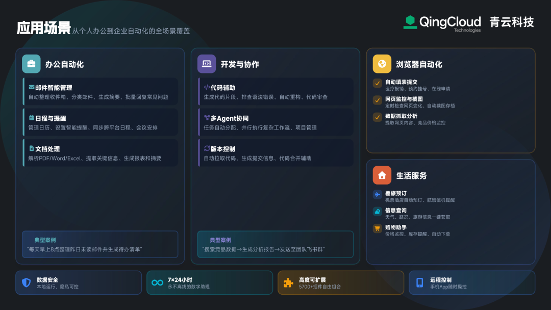 与此同时,青云充分发挥技术优势,依托在云计算、云原生、智算等领域的积累与经验,为政务场景 AI Agent 落地提供全维度支撑。首先,青云不仅支持智算基础设施的本地化搭建,也支持大模型的本地私有化部署,实现模型、数据、操作全在本地闭环。其次,青云可提供安全化的云端服务与云地融合部署方案,云上服务实现数据不留存,既满足政府工作的灵活操作需求,又确保数据交互的安全可控。更重要的是,青云构建了精细化的权限限制与流程追溯机制。