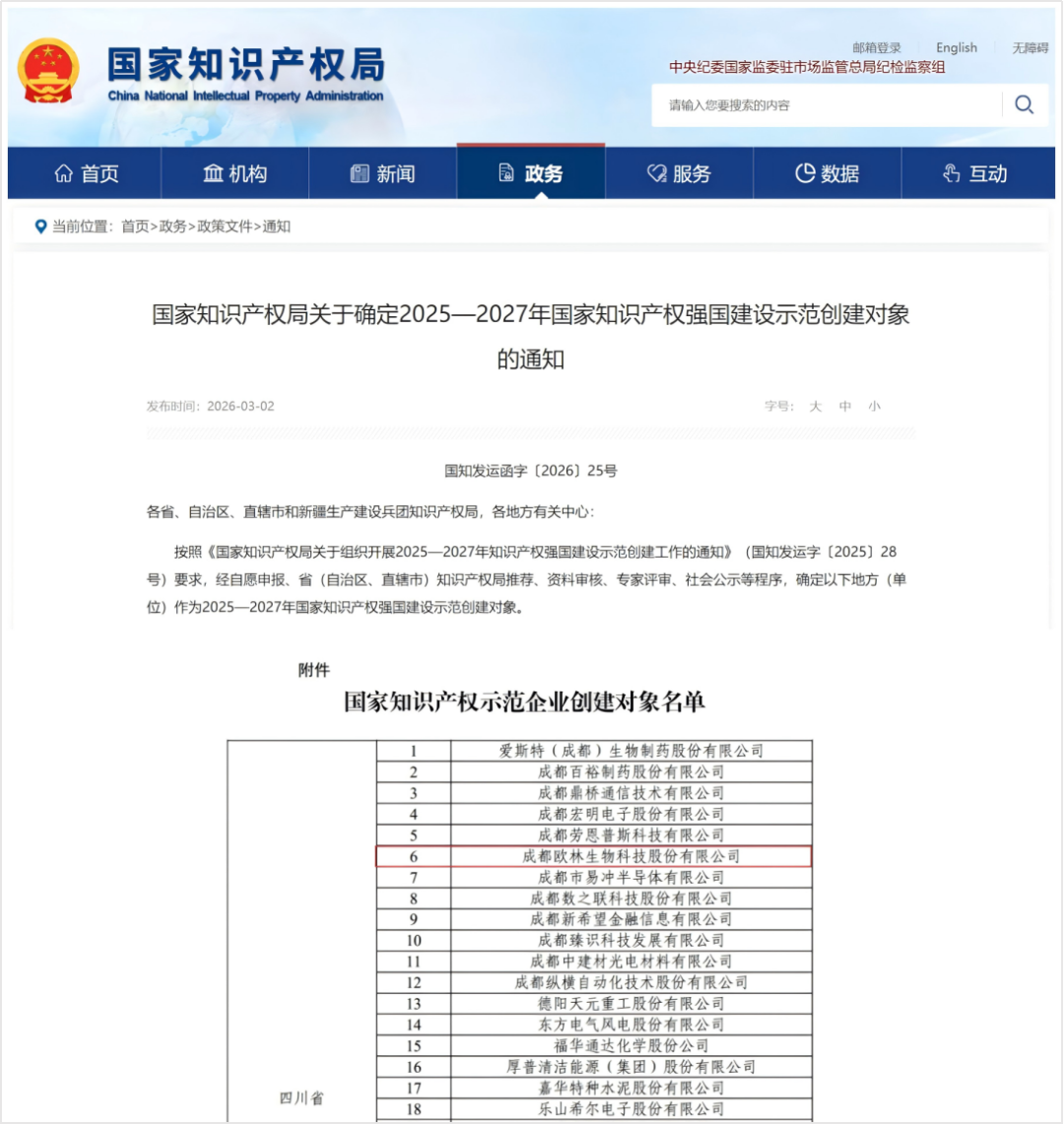 近日,国家知识产权局印发《关于确定2025—2027年国家知识产权强国建设示范创建对象的通知》,成都欧林生物科技股份有限公司(以下简称“欧林生物”)凭借在知识产权综合管理方面的系统性布局与突出成效,成功入选“国家知识产权示范企业创建对象”。