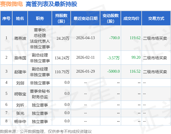 赛微微电的高管列表及最新持股情况如下: