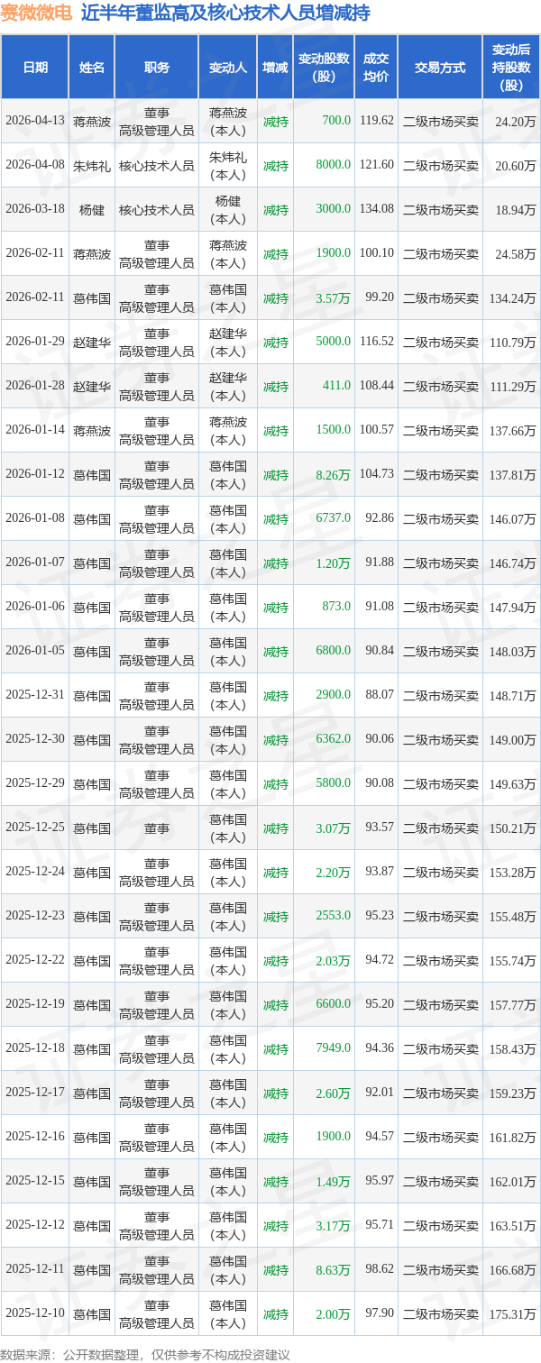 赛微微电近半年内的董监高及核心技术人员增减持详情如下: