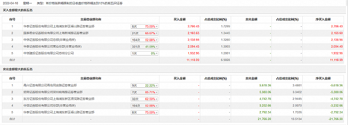 具体来看,甬兴证券有限公司青岛同安路证券营业部、招商证券深圳前海路证券营业部分别卖出5618.36万元、5380.06万元;华泰证券上海浦东新区福山路证券营业部、国泰君安证券上海新闸路证券营业部分别买入2786.43万元、2165.63万元。