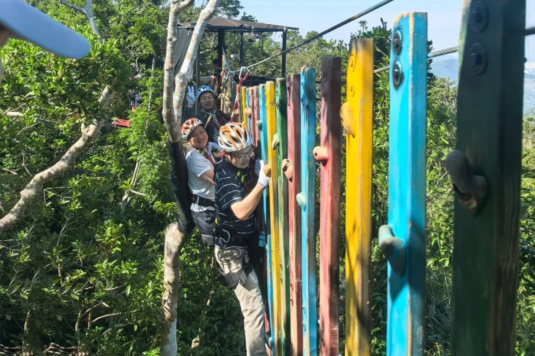 为进一步凝聚团队力量,实践锤炼团队协作精神,期间精心设计系列户外拓展项目。「高空索道」团队成员需直面高空挑战、突破心理障碍、完成连续跨越动作,前方队员加油鼓舞,为挑战者坚定挑战信心。