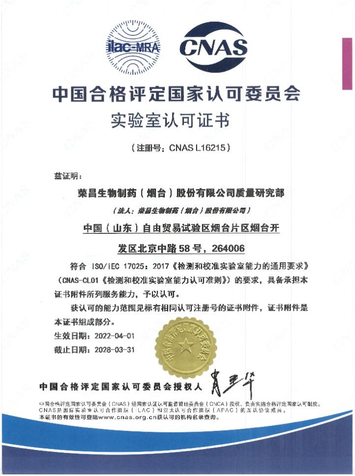4月15日,荣昌生物制药(烟台)股份有限公司(港交所代码:09995;科创板代码:688331)宣布:公司质量研究部实验室正式通过中国合格评定国家认可委员会(CNAS)认可(ISO17025),获得“生物制品”理化检测领域实验室认可证书。这标志着荣昌生物申请的认可项目获得“国际通行证”,具备了按相应认可准则开展检测服务的技术能力,可在认可的范围内使用CNAS国家实验室认可标志和ILAC(国际实验室认可合作组织)国际互认联合标志。