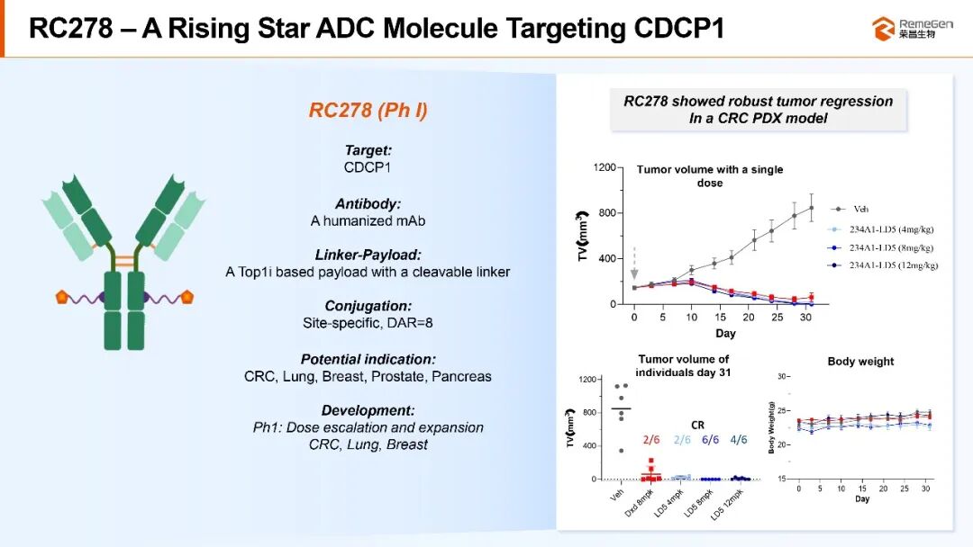 RC278是一款靶向新型肿瘤抗原CDCP1的ADC,采用定点偶联技术,药物抗体比(DAR)为8,载荷为强效的拓扑异构酶I抑制剂。临床前研究显示,在结直肠癌(CRC)PDX模型中,RC278单次给药即能实现深度且持久的肿瘤消退,甚至观察到完全缓解(CR),同时展现出良好的安全性特征。目前该药已进入Ⅰ/Ⅱ期临床,重点探索在结直肠癌、肺癌、乳腺癌等领域的治疗潜力,有望成为下一个重磅产品。