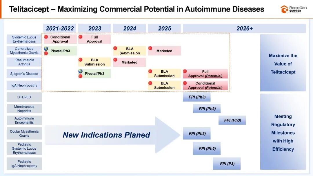 泰它西普已有系统性红斑狼疮(SLE)、类风湿关节炎(RA)、全身型重症肌无力(gMG)等3项适应症获批上市销售,治疗干燥综合征(SS)和IgA肾病(IgAN)适应症国内上市申请已获正式受理,正在跃迁为一场关于“系统性攻克B细胞介导的自身免疫疾病”的平台化探索。