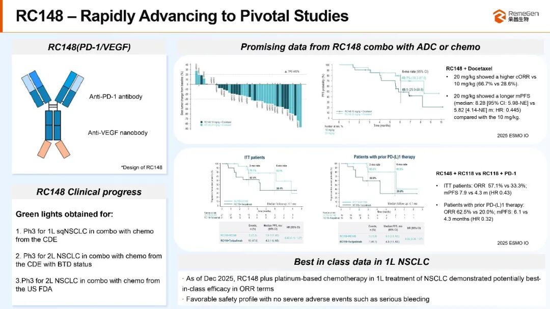 另外值得关注的是,在本次JPM大会上首次披露RC148联合铂类化疗在一线治疗非小细胞肺癌(NSCLC)中展现出在客观缓解率(ORR)方面具备同类最佳潜力,且安全性良好。