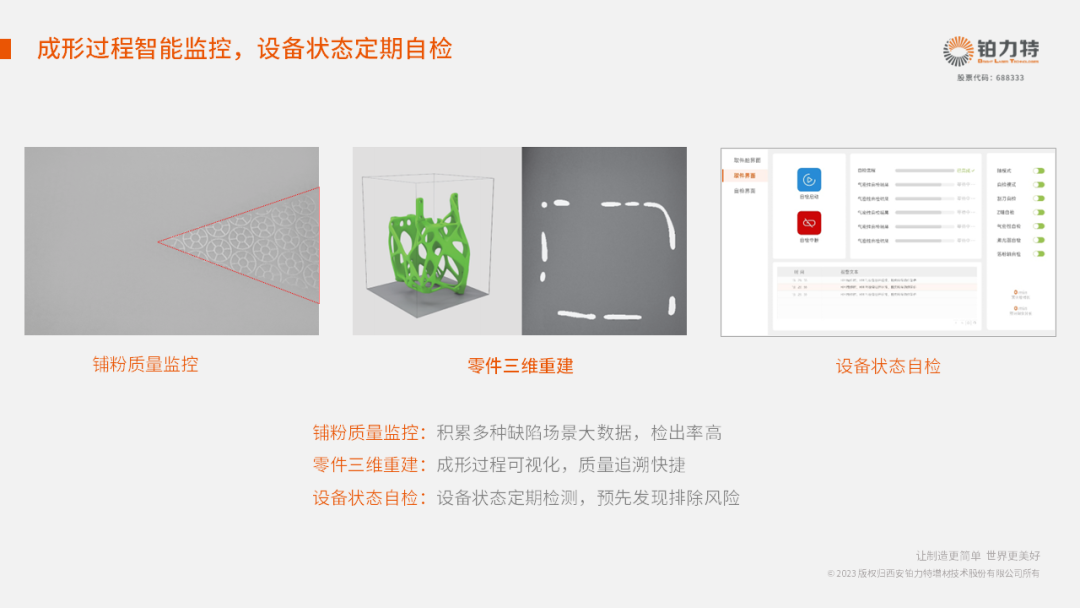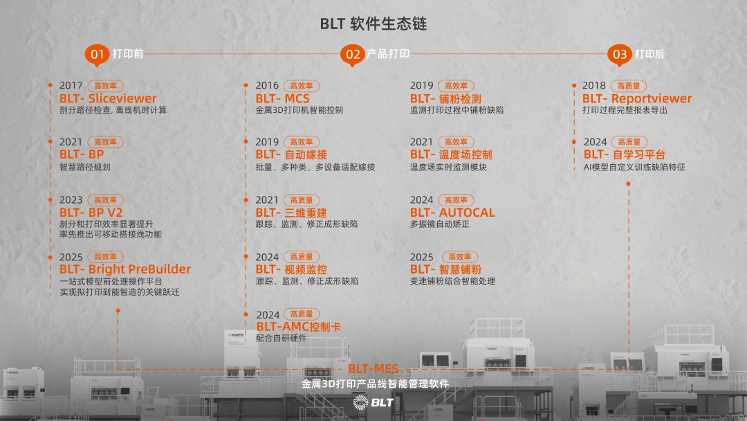 软件是实现效率突破与质量提升的引擎,2025年度,前处理平台BLT-Bright PreBuilder正式面市,以全流程解决方案实现“拟打印”到“能智造”的关键跃迁,BLT闭环软件生态链得以覆盖增材制造全流程,为工程化批产提供有力支持。智能化质量系统BLT-PrintInsight可基于多源数据融合与AI智能分析,实现打印任务从成形到评估的全链条质量管理,让增材制造过程智能化、透明化、可追溯。为大规模生产而生的智能产线管理系统BLT-MES 2.0和工艺规划软件BLT-BP V2在2025年的工程化生产实践中实现了项目内部总、子公司产线协同、高效运转、密级管理等功能。
