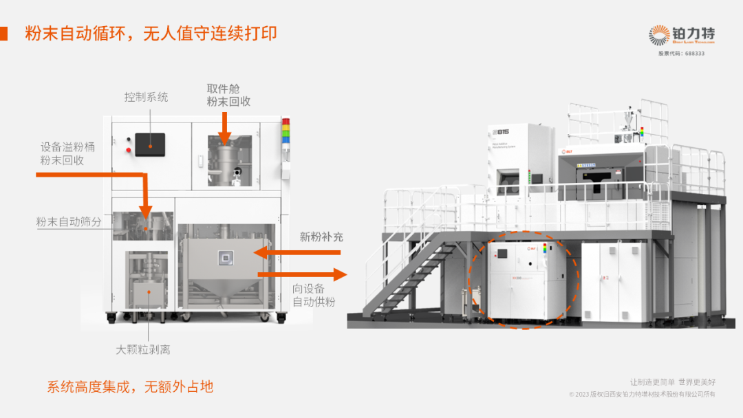 此外,自动粉末循环系统的应用解决了大尺寸多激光设备生产周期长、粉末流转节奏快的管理难题。通过自动化粉末回收、筛分和供应流程,既保证了连续生产的需求,又提高了粉末使用效率与周转率,在保证产品质量一致性的同时实现高效流转的批产目标,满足工业领域中超大型、一体化构件的规模化生产要求。
