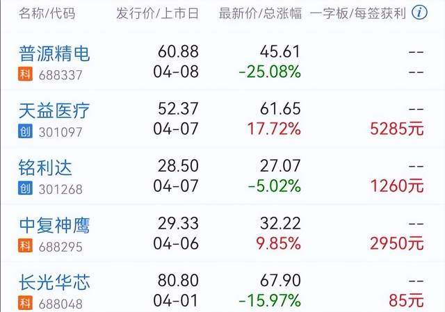 从4月1号以来,有5只新股上市,分别是长光华芯、中复神鹰、铭利达、天益医疗、普源精电。目前有3只新股已跌破发行价,破发率达60%。