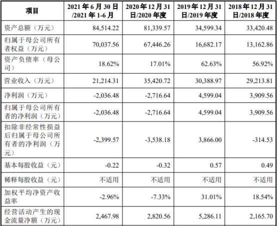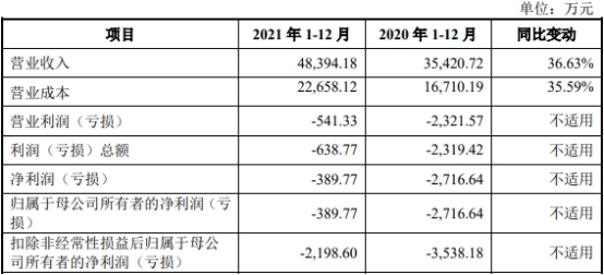 2021年,公司实现营业收入4.84亿元,较上年度同比增长36.63%;实现归属于母公司所有者的净利润-389.77万元;实现扣除非经常性损益后归属于母公司所有者的净利润-2198.60万元;经营活动产生的现金流量净额为6192.71万元,同比增长119.56%。