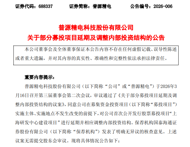 3月16日,普源精电(688337)发布公告称,公司第三届董事会第二次会议审议通过相关议案,决定在实施主体、实施地点不变的前提下,对IPO募投项目“上海研发中心建设项目”实施延期,并同步优化调整项目内部投资结构。这已是该项目继2025年3月后的第二次延期,此次将预定可使用状态日期再度延后至2027年4月。