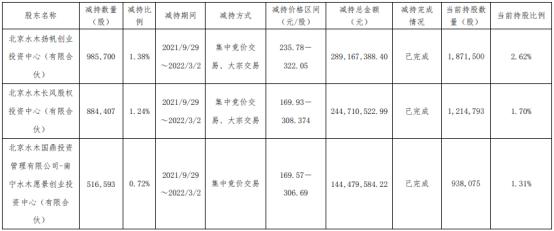 公告显示,减持前水木扬帆、水木长风、水木愿景分别持有公司股份2,857,200股、2,099,200股、1,454,668股,分别占公司普通股总股本4%、2.94%、2.04%,本次减持后分别持有股份1,871,500股、1,214,793股、938,075股,分别占公司普通股总股本比例为2.62%、1.70%、1.31%。