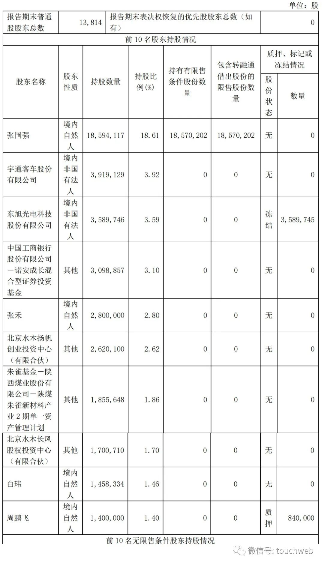 宇通客车股份有限公司持股3.92%,东旭光电科技股份有限公司持股3.59%,中国工商银行股份有限公司-诺安成长混合型证券投资基金持股为3.1%,张禾持股为2.8%;