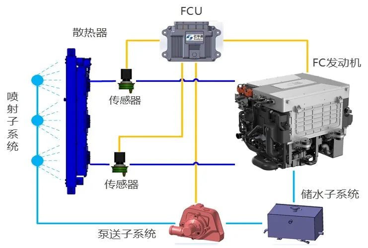 亿华通汽化潜热系统巧妙地利用燃料电池自产水,作为汽化潜热的冷却介质,快速响应发动机的散热需求,将水均匀喷射于散热器外表面上,利用水汽化相变带走电堆产生的热量。系统主要包含储水子系统、泵送子系统、喷射子系统,采用闭环控制,按需精确控制喷射量。同时,子系统部件通用化,可快速适配不同的发动机平台。