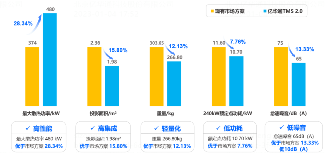 通过汽化潜热模块化以及散热系统的小型化设计,TMS 2.0热管理系统集成度高,投影面积仅为1.98m2,优于市场方案15.80%。