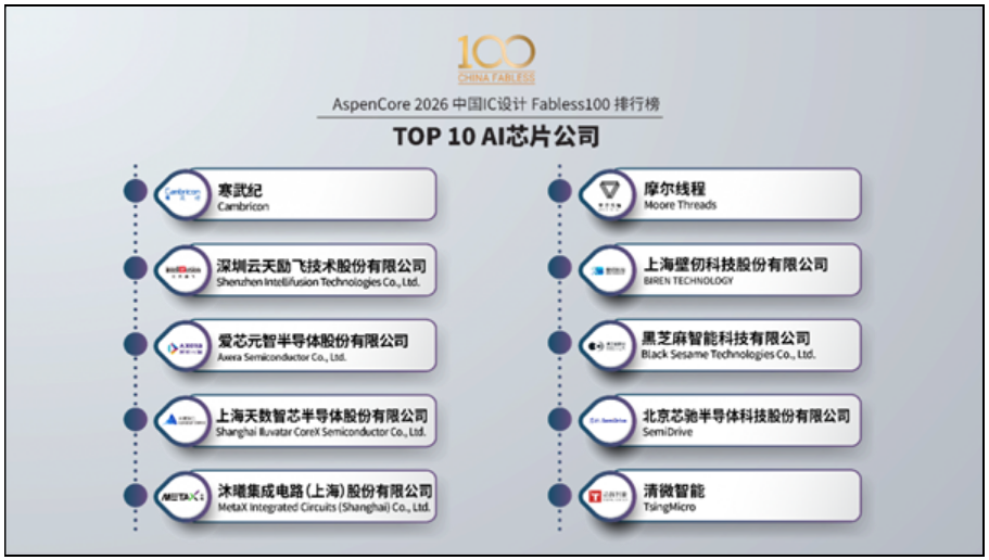 近日消息,AspenCore近日发布了《2026中国IC设计Fabless 100排行榜》,同步揭晓了“2026 AI芯片公司TOP10”榜单。