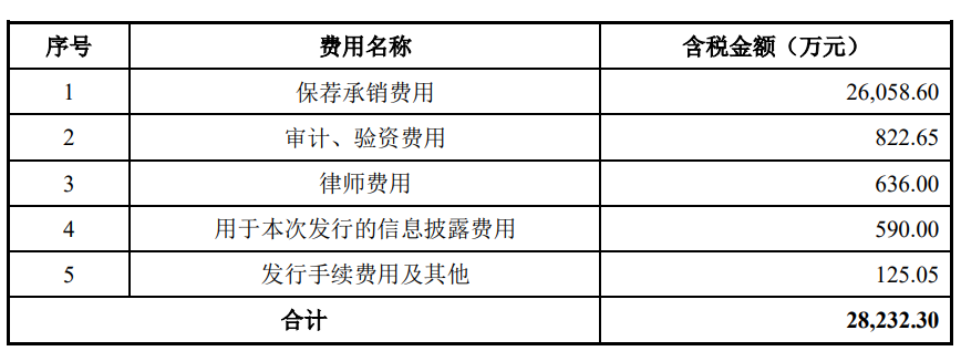 华虹公司本次公开发行新股的发行费用合计28,232.30万元,其中保荐承销费用26,058.60万元。