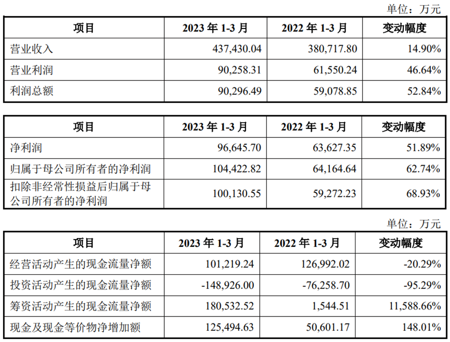 2023年1-3月,华虹公司营业收入为437,430.04万元,同比增长14.90%;净利润为96,645.70万元,同比增长51.89%;归属于母公司所有者的净利润104,422.82万元,同比增长62.74%;扣除非经常性损益后归属于母公司所有者的净利润为100,130.55万元,同比68.93%;经营活动产生的现金流量净额为101,219.24万元,同比下降20.29%。
