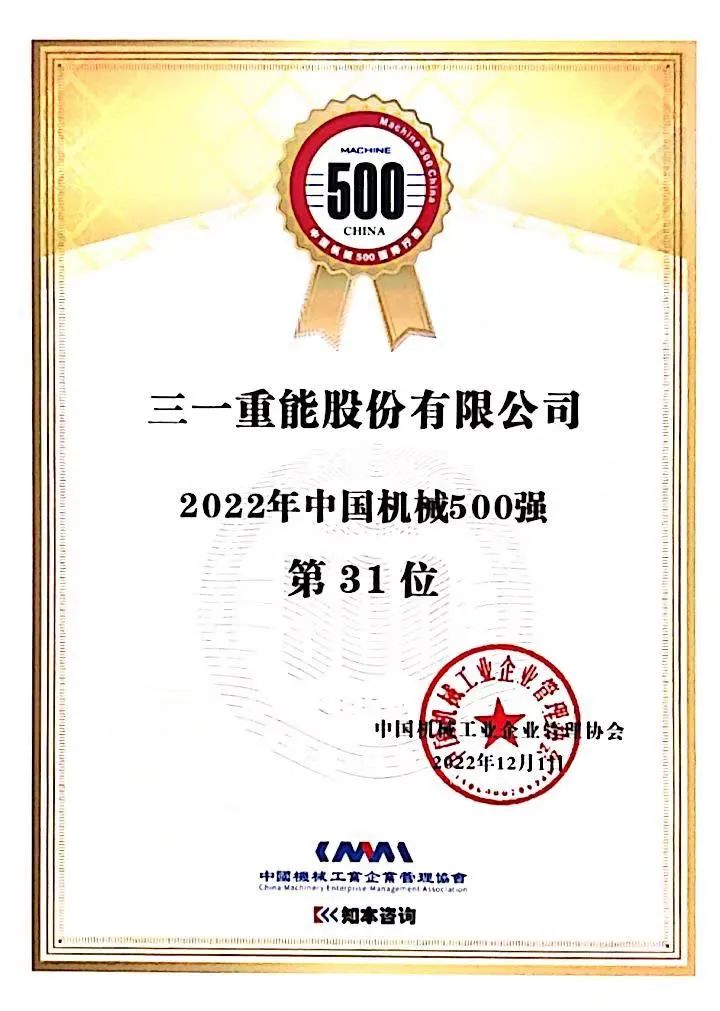 近日,中国机械工业企业管理协会发布了2022年“中国机械500强”名单,三一重能股份有限公司上榜,排名第31位。三一重能在新能源装备制造领域的综合实力再获权威认可。