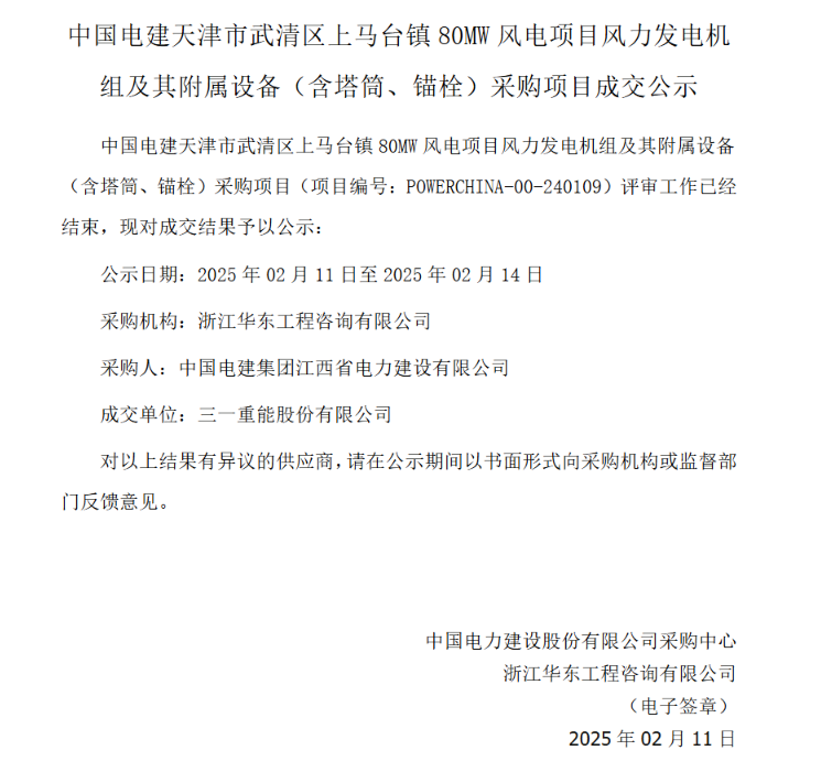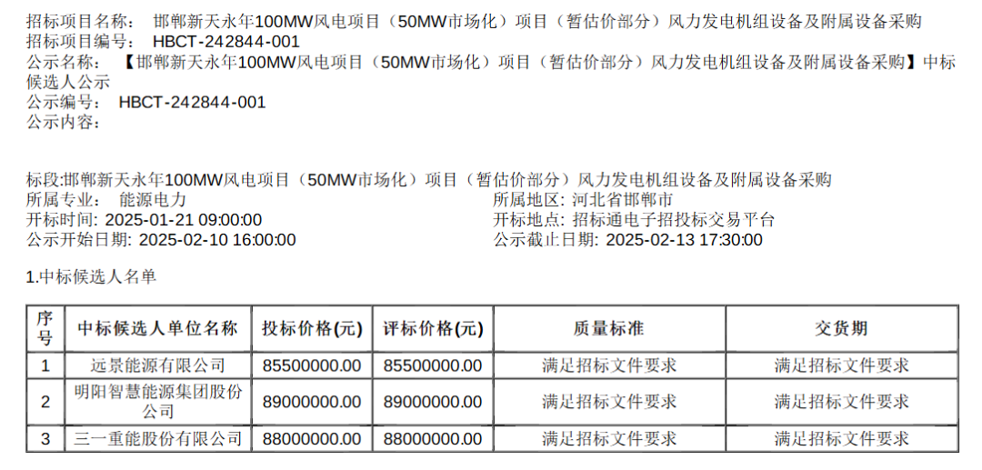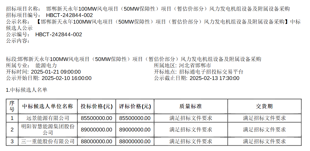 邯郸新天永年100MW风电项目、中国电建天津市武清区上马台镇80MW风电项目风力发电机组及其附属设备(含塔筒、锚栓)采购项目成交公示,远景能源、三一重能中标。