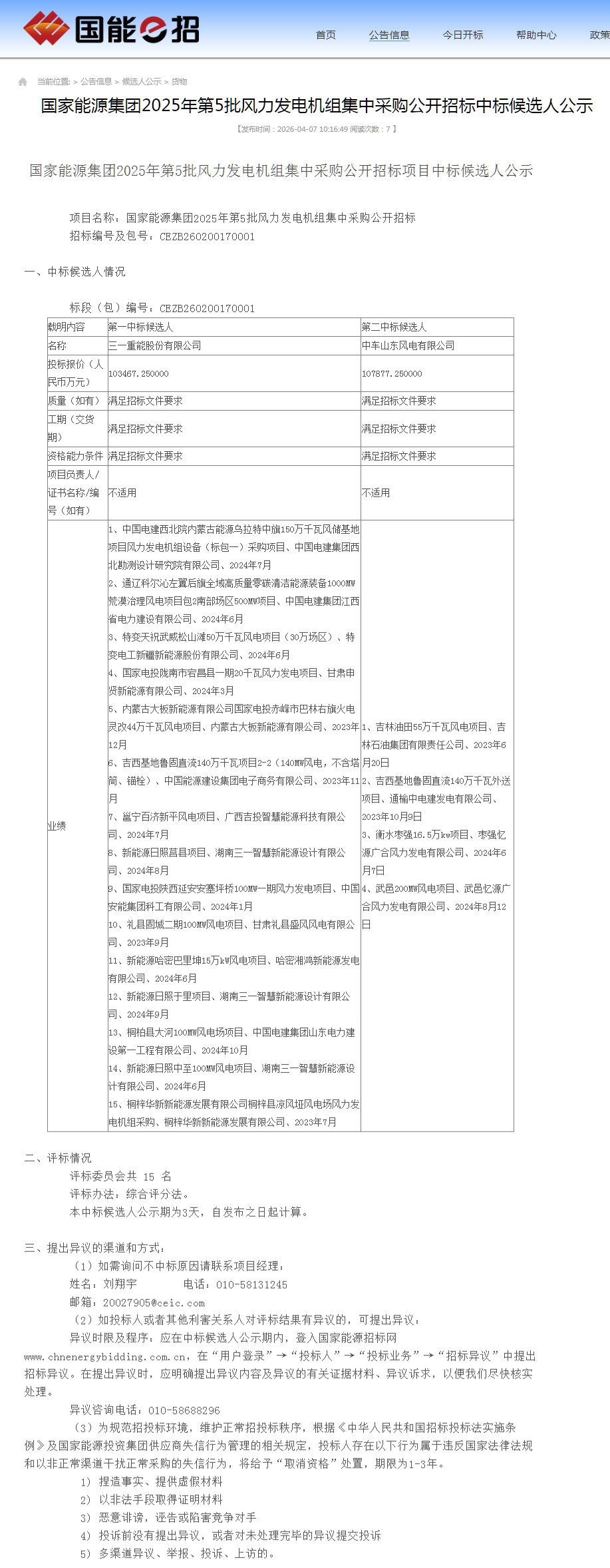 根据候选公示,三一重能作为第一中标候选人预中标。