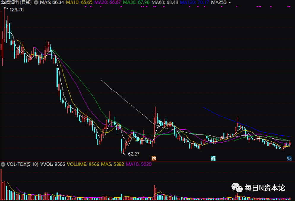 但没有想到,华盛锂电上市后第三天摸高129.2元后,便开始步入下行通道,股价一路下跌至2022年10月31日的62.27元。之后,华盛锂电的股价开始横盘震荡。
