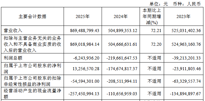2023年至2025年,公司营业收入分别为5.25亿元、5.05亿元、8.69亿元,归属于上市公司股东的净利润分别为-2,391.18万元、-1.75亿元、1,325.66万元,归属于上市公司股东的扣除非经常性损益的净利润分别为-6,332.96万元、-2.09亿元、-5,459.43万元,经营活动产生的现金流量净额分别为-1.35亿元、-1.11亿元、-2.57亿元。
