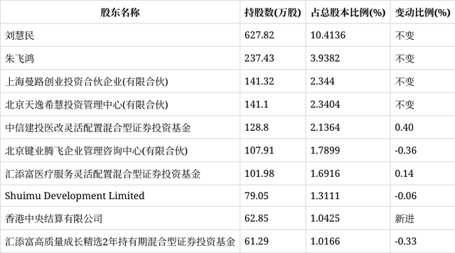 三季报显示,2022年三季度末的公司十大流通股东中,新进股东为香港中央结算有限公司,取代了二季度末的广发医疗保健股票型证券投资基金。在具体持股比例上,中信建投医改灵活配置混合型证券投资基金、汇添富医疗服务灵活配置混合型证券投资基金持股有所上升,北京键业腾飞企业管理咨询中心(有限合伙)、Shuimu Development Limited、汇添富高质量成长精选2年持有期混合型证券投资基金持股有所下降。