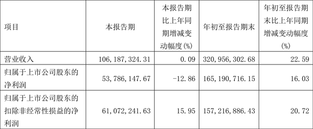 根据三季报,公司第三季度实现营业总收入1.06亿元,同比增长0.09%,环比下降6.79%;归母净利润5378.61万元,同比下降12.86%,环比下降8.94%;扣非净利润6107.22万元,同比增长15.95%,环比增长15.35%。
