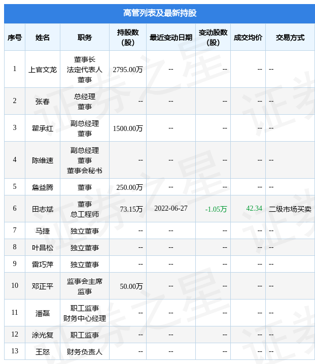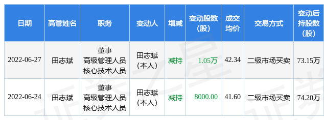 根据6月29日市场公开信息、上市公司公告及交易所披露数据整理,三孚新科(688359)最新董监高及相关人员股份变动情况:2022年6月27日公司董事,高级管理人员,核心技术人员田志斌共减持公司股份1.05万股,占公司总股本为0.0114%。变动期间公司股价上涨4.27%,6月27日当日收盘报42.75元。