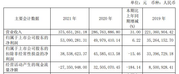 2022年4月22日,三孚新科发布2021年年度报告。2021年,三孚新科营业收入3.76亿元,同比增长31.00%;归属于上市公司股东的净利润5309.03万元,同比增长6.22%;归属于上市公司股东的扣除非经常性损益的净利润3853.86万元,同比减少15.46%;经营活动产生的现金流量净额-2735.09万元,上年同期为3250.51万元。