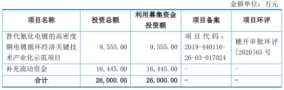 三孚新科本次募集资金总额为2.54亿元,扣除发行费用后,募集资金净额为2.03亿元。三孚新科最终募集资金净额比原计划少5714.11万元。三孚新科2021年5月18日披露的招股说明书显示,公司拟募集资金2.60亿元,其中9555.00万元用于替代氰化电镀的高密度铜电镀循环经济关键技术产业化示范项目、1.64亿元用于补充流动资金。
