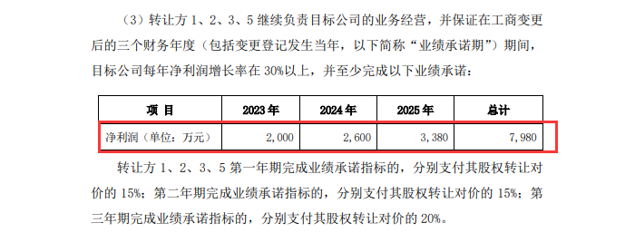前述公告显示,2022年度、2023年前四个月,江西博泉的净利润分别为0.11亿元、0.05亿元。而根据对赌协议,江西博泉在2023年度至2025年度,分别实现净利润:2,000万元、2,600万元、3,380万元,合计7,980万元。