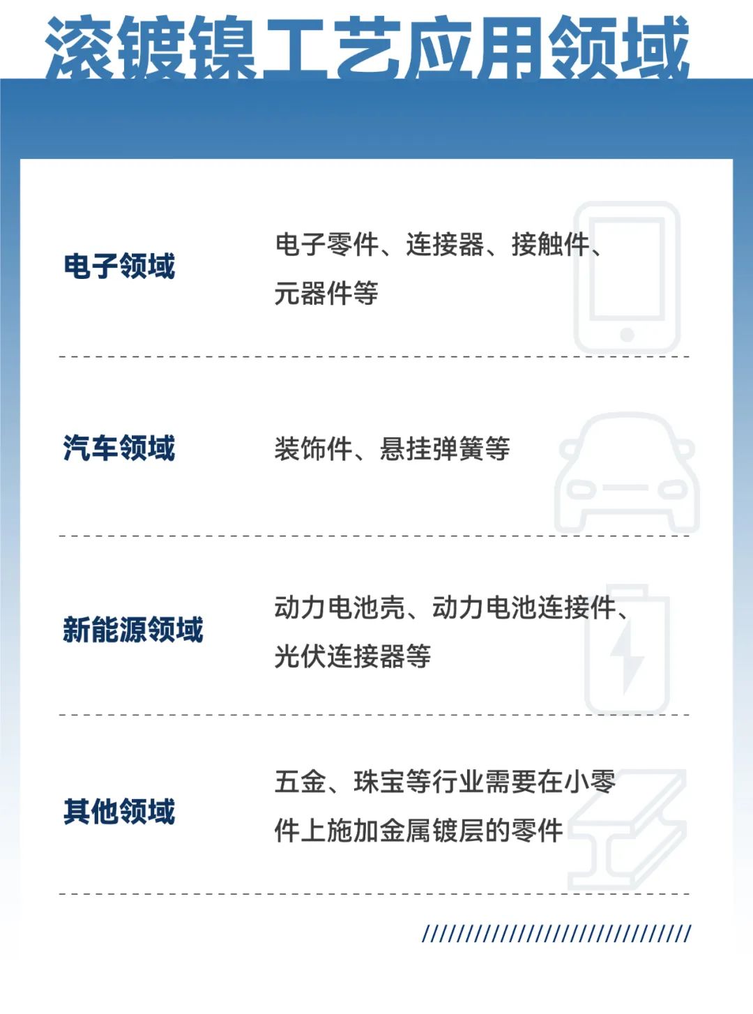 三孚新科滚镀镍技术是已经过验证的成熟工艺,除了在新能源领域电池壳等产品的应用外,在通用五金、照明领域亦有成熟应用。