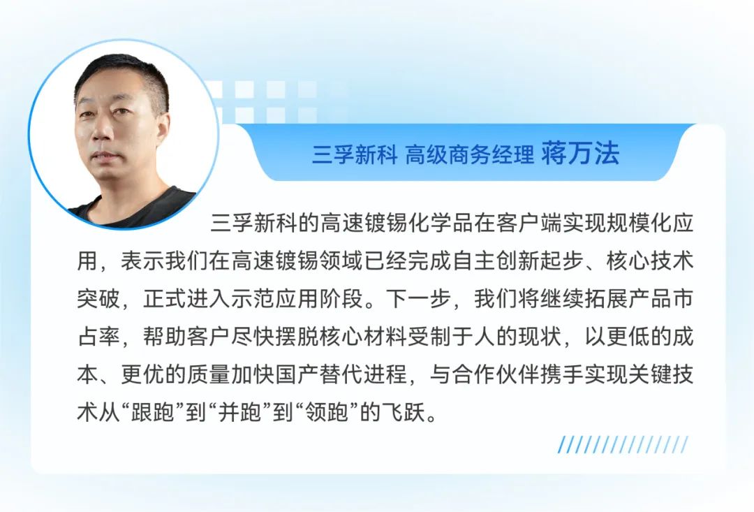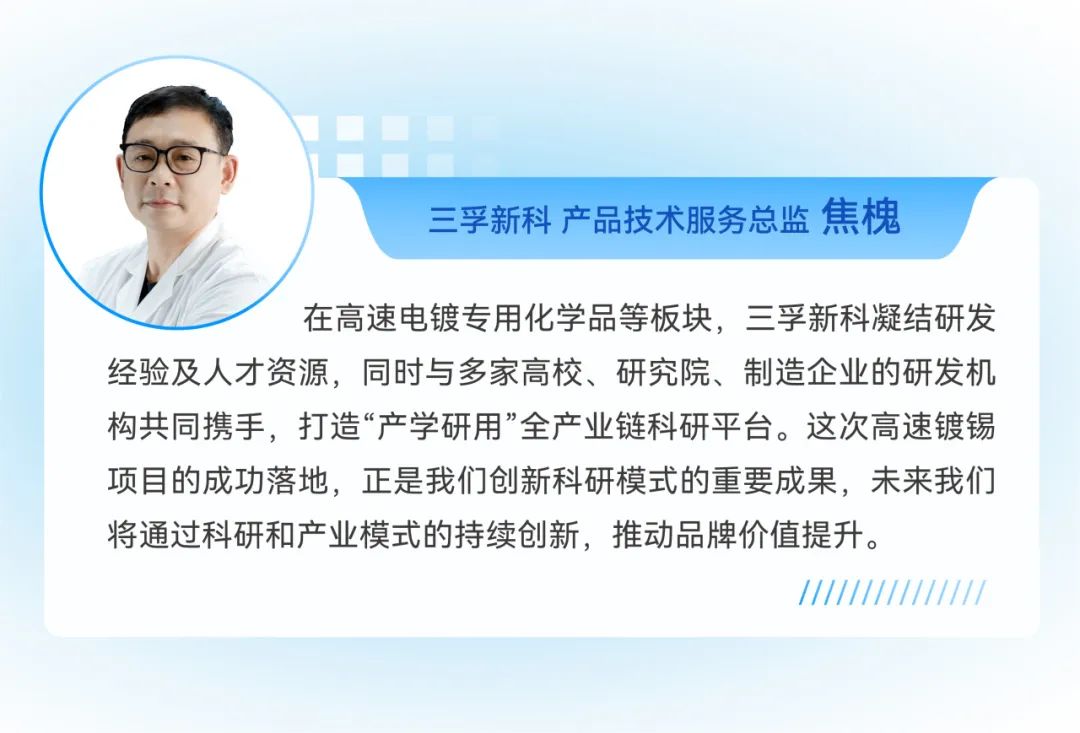 三孚新科高速镀锡首个产业化应用项目,已在新烜新材料(泰州)有限公司正式上线并已成功运行1个月,各项指标表现优异,实现产业化应用!
