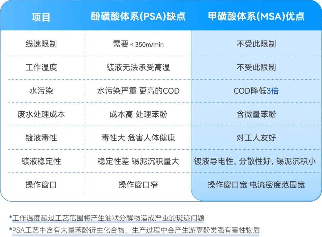 新烜新材料(泰州)有限公司产线原使用PSA体系高速镀锡化学品,面临着工艺稳定性低、生产环境较差、废水处理压力大等问题。三孚新科基于在高速镀锡专用化学品上的多年研发经验及前期实验室小试经验,派驻专业研发技术团队,与客户共同完成PSA到环保型MSA体系的切换。