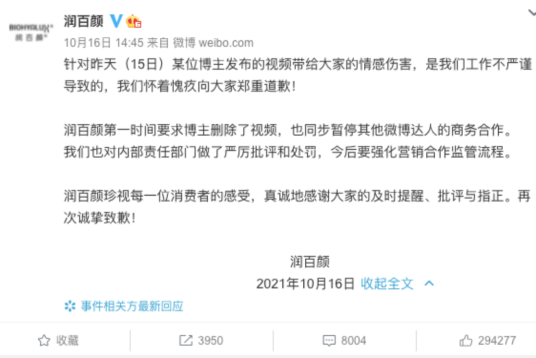润百颜称第一时间要求博主删除了视频,也同步暂停其他微博达人的商务合作。道谢信中,润百颜表示,“我们也对内部责任部门做了严厉批评和处罚,今后要强化营销合作监管流程”。