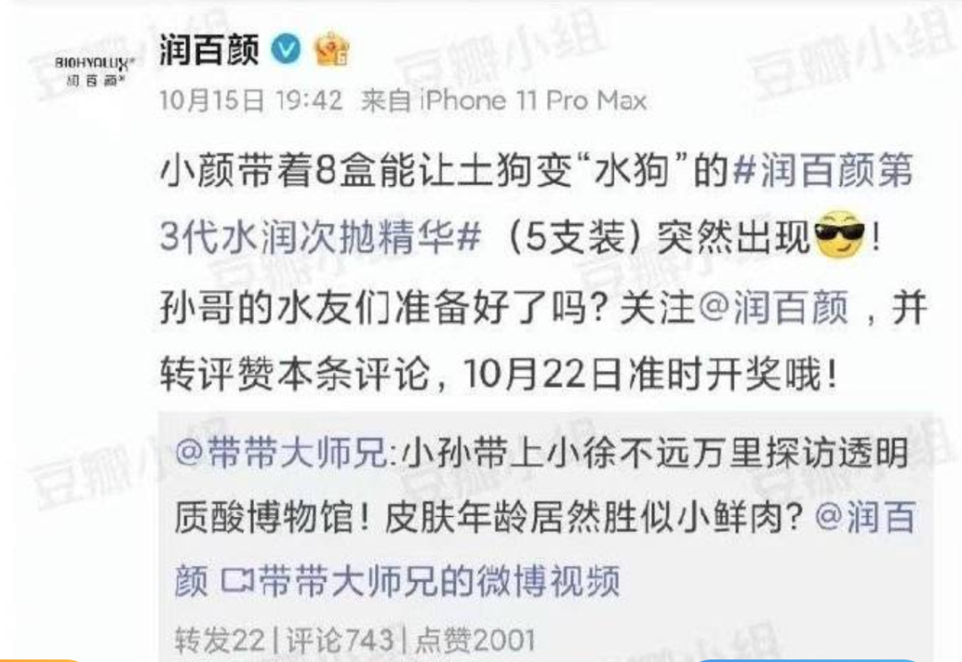 据了解,微博网红“带带大师兄”发布了润百颜推广视频,视频中,博主来到润百颜公司透明质酸博物馆,拍摄了15分钟视频,为润百颜次抛精华做推广。“带带大师兄”是网红孙笑川的微博账号昵称,孙笑川原本是一名网络主播,在走红后,由于其粉丝言论低俗且经常涉及辱女言论而被网友所反感。由于孙笑川的粉丝自称“狗粉丝”,因此在转发“带带大师兄”的推广视频时,润百颜官方微博调侃称,“小颜带着8盒能让土狗变‘水狗’的润百颜第3代水润次抛精华突然出现!”