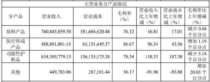 华熙生物业务主要围绕原料业务、医疗终端业务、功能性护肤品业务、功能性食品业务四大业务展开。业绩下滑和华熙生物引以为豪的功能护肤品业务直接相关。
