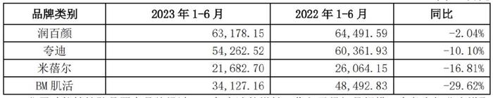 相较实现双位数增长的原料和医疗板块,2023年上半年,华熙生物的功能性护肤品业务收入为19.66亿元,同比下降了7.56%。该部分业务占公司主营业务收入的 63.92%,毛利率为 74.49%,相比去年同期下降了4.25 个百分点。其中,华熙生物旗下的四大品牌营收均出现了下滑。